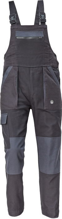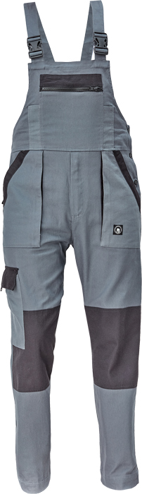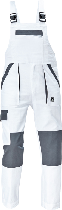 pánské pracovní kalhoty s laclem a elastickým pasem; široké šle s plastovými sponami; 2 přední kapsy, 1 stehenní kapsa; 1 velká náprsní kapsa, 2 zadní kapsy; zesílená oblast kolen; nastavitelná délka nohavic.