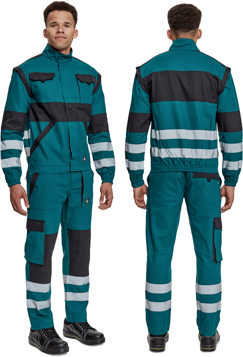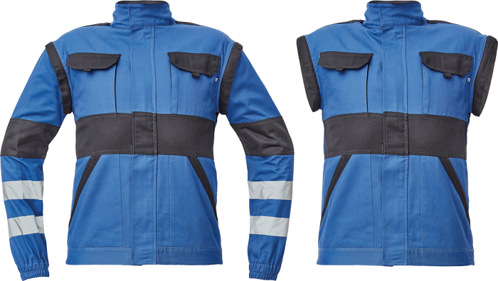 pánská pracovní bunda se zapínáním na zip krytým légou; odepínatelné rukávy; 2 přední kapsy, 2 náprsní kapsy; zesílení namáhaných míst loktů a ramen; reflexní pruhy po odvodu rukávů a ve spodní části zad; pružné manžety rukávů a spodní obvod v pase.