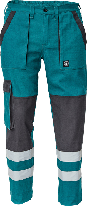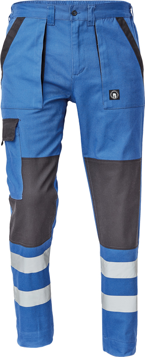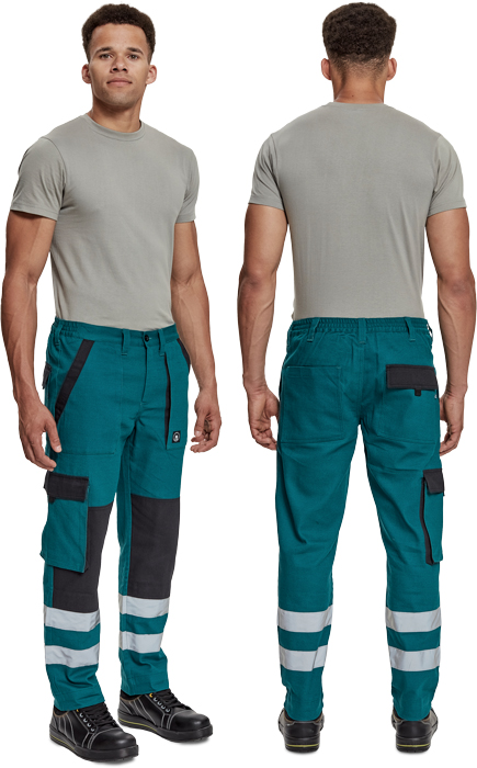 pánské pracovní kalhoty s elastickým pasem; 2 přední kapsy, 1 stehenní kapsa, 2 zadní kapsy; reflexní pruhy na spodní části nohavic; zesílená oblast kolen; nastavitelná délka nohavic.