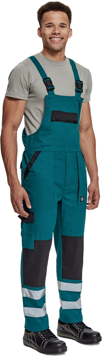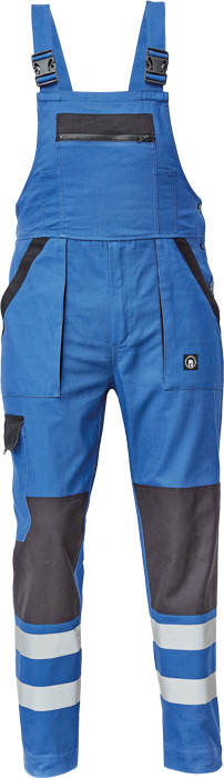 pánské pracovní kalhoty s laclem a elastickým pasem; široké šle s plastovými sponami; 2 přední kapsy, 1 stehenní kapsa; 1 velká náprsní kapsa, 2 zadní kapsy; reflexní pruhy na spodní části nohavic; zesílená oblast kolen.