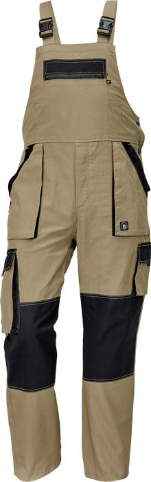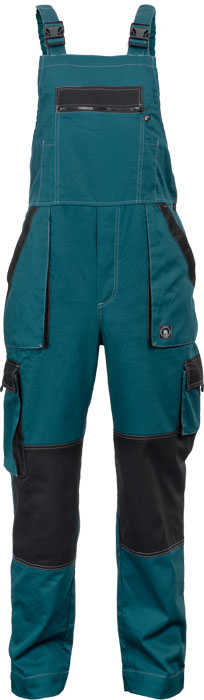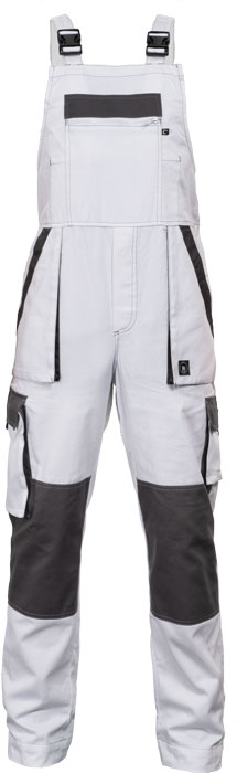 pánské lehké pracovní kalhoty s laclem a elastickým pasem; široké šle s plastovými sponami; 2 přední kapsy, 2 stehenní kapsy; 1 velká náprsní kapsa na zip, 2 zadní kapsy; zesílení nohavic v oblasti kolen.