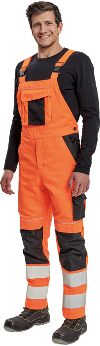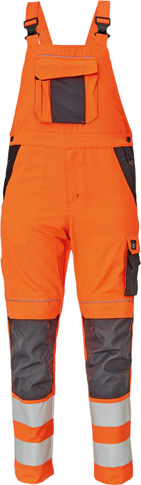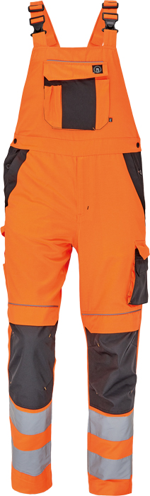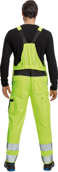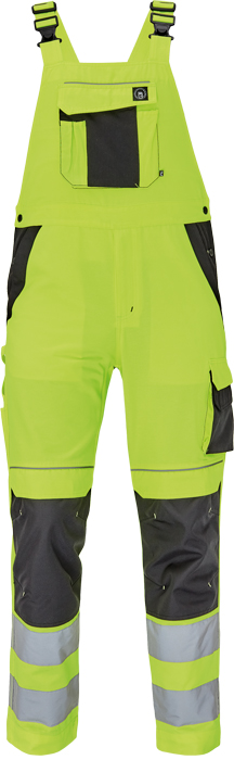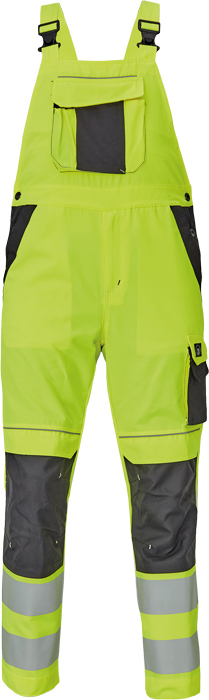 pánské HI-VIS pracovní kalhoty s laclem a elastickým pasem; široké šle s plastovými sponami; 2 přední kapsy, 1 levá zdvojená stehenní kapsa; 1 velká náprsní kapsa na suchý zip, 2 zadní kapsy, 2 menší zadní kapsičky na pravém stehnu; dvojice tištěných 7.5 cm reflexních pruhů na spodní části nohavic, reflexní paspulky; Oxford 600D zesílení kolen s možností horního vkládání nákoleníků; možnost prodloužení nohavic.