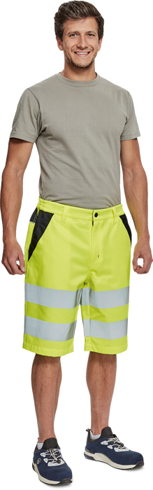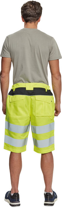 pánské HI-VIS pracovní šortky s elastickým pasem; 2 přední kapsy, 2 zadní kapsy; dvojice tištěných 7 cm reflexních pruhů po obvodu stehen; reflexní paspulky.