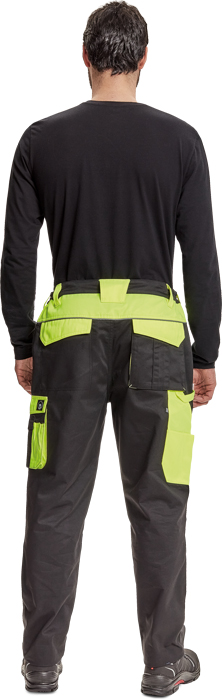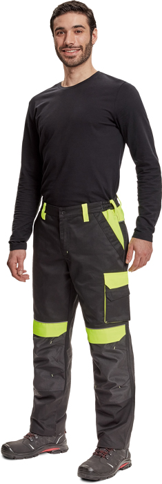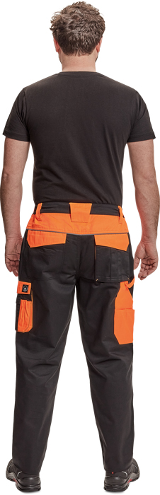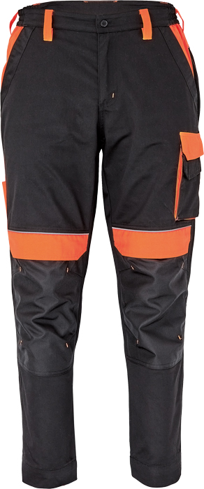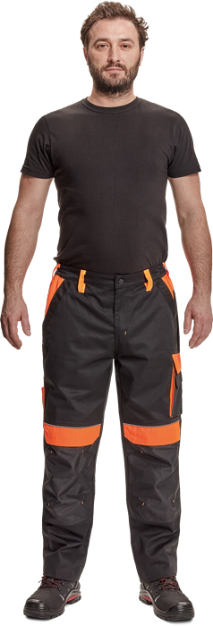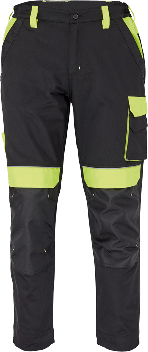 pánské pracovní kalhoty s elastickým pasem; 2 přední kapsy, 1 levá zdvojená stehenní kapsa; 2 zadní kapsy, 2 menší zadní kapsičky na pravém stehnu; reflexní paspulky; Oxford 600D zesílení kolen s možností horního vkládání nákoleníků; možnost prodloužení nohavic.