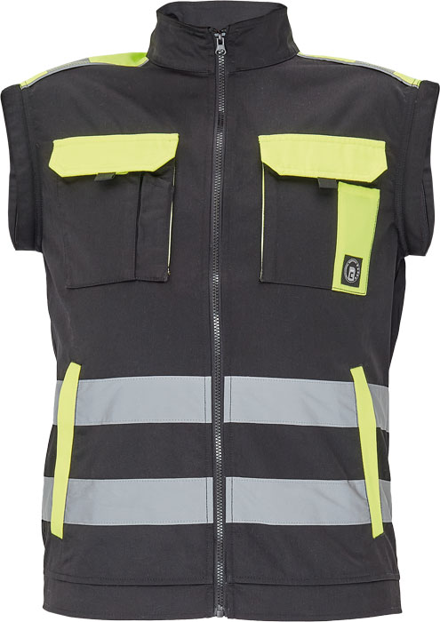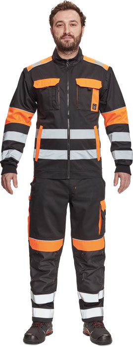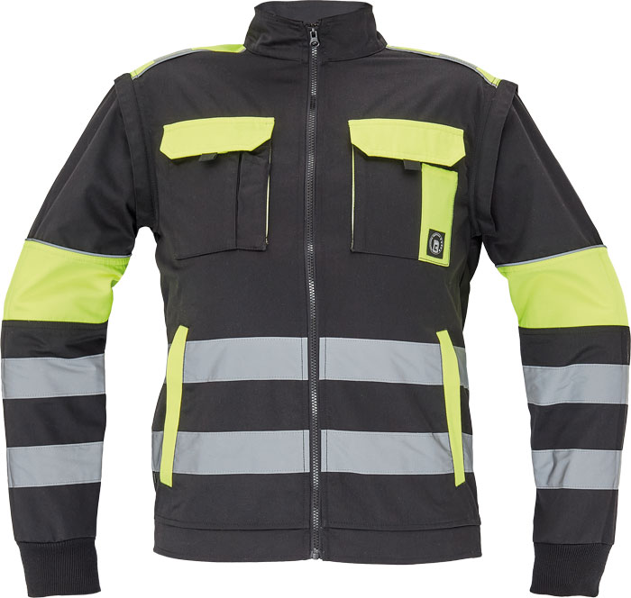 pánská reflexní pracovní bunda se zapínáním na zip; odepínatelné rukávy; 2 přední kapsy, 2 náprsní kapsy; zesílení namáhaných míst loktů a ramen; dvojice našitých 5 cm reflexních pruhů přes spodní obvod pasu a rukávů; 2 menší pruhy přes ramena; reflexní paspulky lemující zesílené části rukávů a ramen; pružné náplety manžet rukávů a elastický spodní obvod pasu.