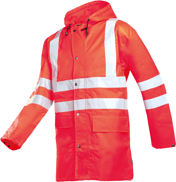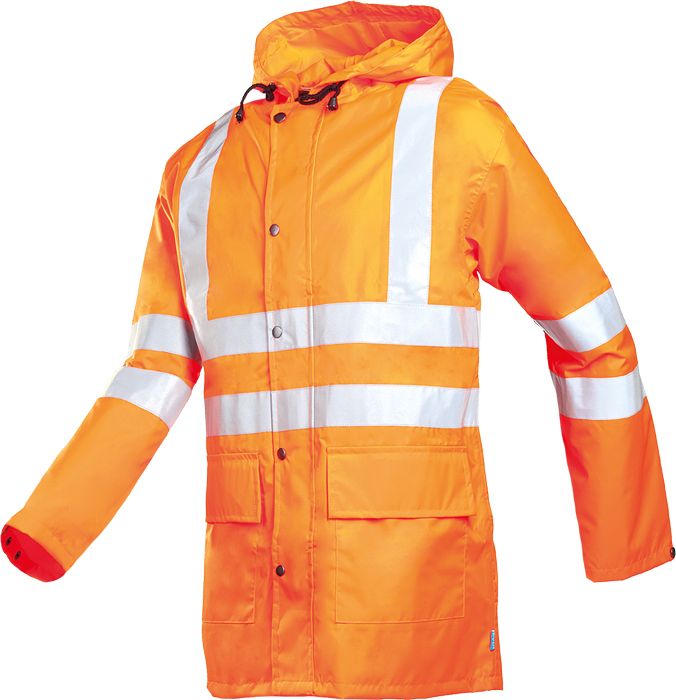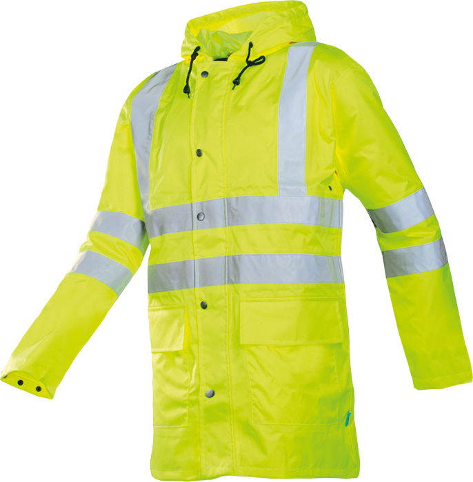 hi-vis nepromokavá a větruodolná bunda s excelentní prodyšností dle EN343 v nejvyšší třídě 3 lehká a velmi pevná konstrukce oděvu zajišťuje vysoký komfort při práci; celopropínací přední zip překrytý légou s uchycením na plastové druky; možnost stažení v pase; větrací otvory v podpaží