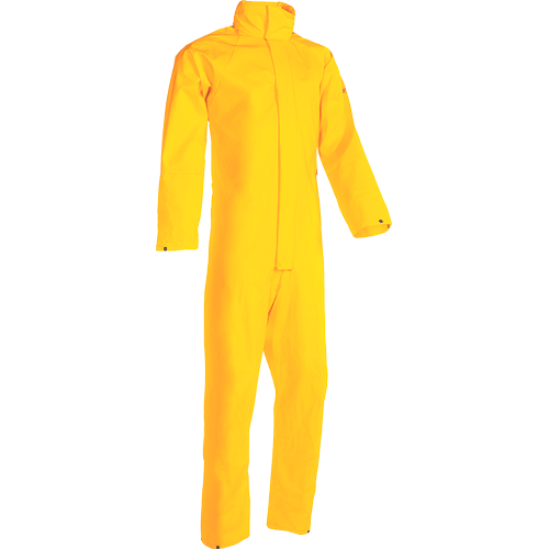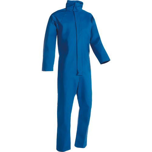 nepromokavá kombinéza s kapucí v límci; zapínání na zip překryté klopou s druky; zatavenými švy; elastická záda v pase, manžety rukávů a spodní okraj nohavic se zapínáním na druky.