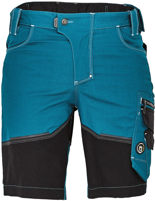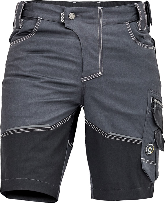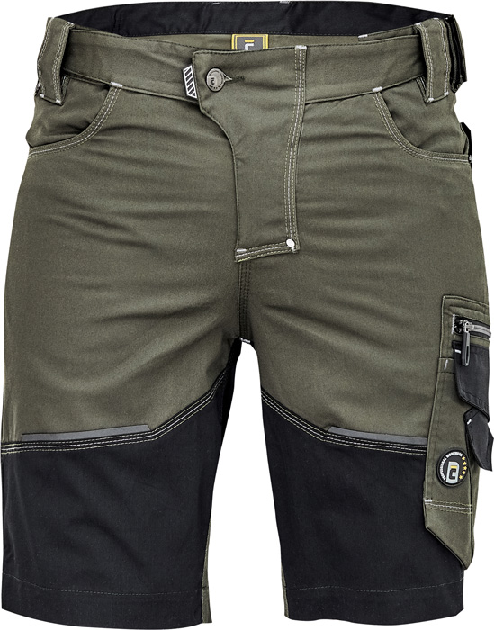 pánské pracovní šortky, elastický inovativní materiál TRIFIBETEX®, slim střih, snížený pružný pas, odolné trojité prošití nohavic a sedu, prostorné multifunkční přední kapsy s poutky na nářadí, 2 zadní kapsy na suchý zip, stehenní kapsa na telefon s klopou a zapínáním na suchý zip, kapsa na metr a nůž, poutko na kladivo, "D" kroužek, poutko na nářadí v pase, originální zpracování zapínání kalhot, reflektivní prvky v barevném odstínu.