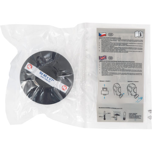 Ochranný filtr oF – 02 CBRn A2B2E2K2SXP3 D R Průměr x výška: 110 x 81mm Hmotnost: 3450g Dýchací odpor při: 30 l/min - 160 Pa, 95 l/min - 600 Pa Koeficient průniku: 99,99% Závitové připojení: EN 148-1 Rd 40x1/7”