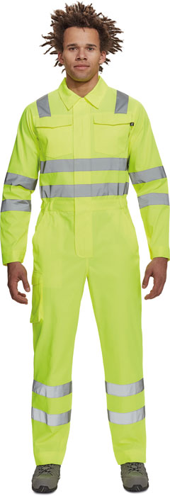 pánský full Hi-Vis pracovní overal s retroreflexním pruhy přes ramena, v bocích, na rukávech a nohavicích, elastický pas, zapínání na zip kryté légou na suchý zip, 2 postranní kapsy + 1 kapsička na drobné, 1 multifunkční stehenní kapsa, 2 náprsní kapsy s klopou, 2 zadní kapsy, nastavitelná délka nohavic