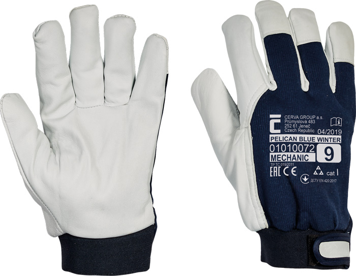 Zateplené rukavice šité z jemné lícové ovčí kůže v dlani, modré bavlněné tkaniny na hřbetu a s manžetou na suchý zip.