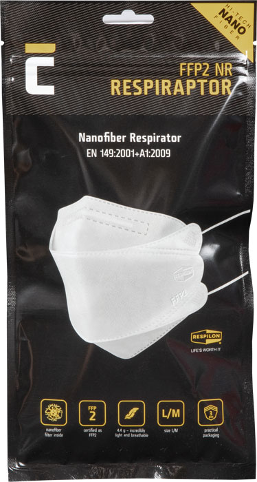 FFP2 NR RespiRaptor se může pochlubit filtrem z nanovláken, který má několik milionů pórů na jednom čtverečním cm. Zabraňuje vniknutí virů, bakterií, smogu a prachu do dýchacích cest. RespiRaptor je respirátor, který je schopný blokovat škodlivé látky použitím vysoce efektivního nanofiltračního materiálu. Vynikající prodyšnost - navzdory vysoké hustotě nanovlákna je membrána propustná pro vzduch a vodu, což zvyšuje komfrot a umožňuje snadné dýchání. Snadné a pohodlné mluvení. Pro lepší přizpůsobení využijte plastovou sponu na sepnutí gumiček za hlavou, která je součástí balení. Dostupné ve velikosti M/L a dvou baleních (3 kusy a 25 kusů).