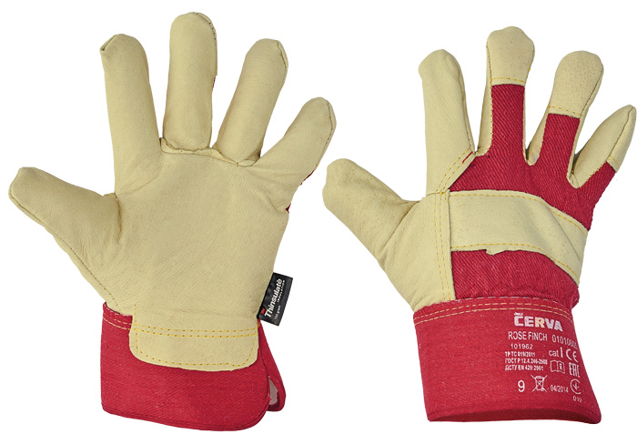 Rukavice z vepřové lícovky v dlani, bavlněné tkaniny na hřbetu a manžetě a se zateplením 3M Thinsulate. Velikosti: dámské 9 (červená), pánské 11 (zelená)