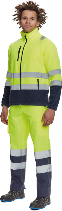 pánská Hi-Vis fleecová bunda s retroreflexními pruhy přes ramena, v bocích a na rukávech, zapínání na zip, 1 náprsní kapsa a 2 postranní kapsy na zip, elastické lemy rukávů a boků