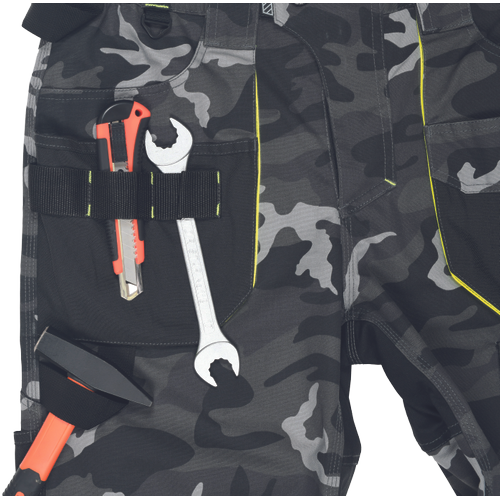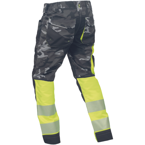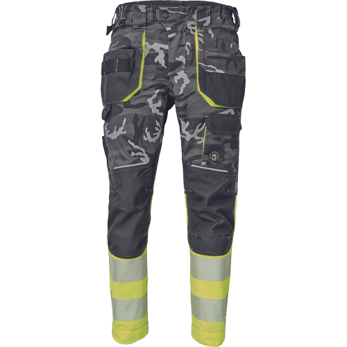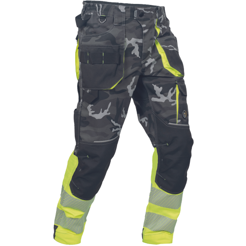 pánské pracovní HI-VIS kalhoty s pružným pasem a multifunkčními kapsami; v moderní úpravě šedé kamuflážové barvy; Oxford 600D zesílení kolenních kapes pro vkládání ochranných nákoleníků; odolné trojité prošití nohavic a sedu; 2 tištěné reflexní segmentované 7 cm pruhy na spodní části nohavic; nastavitelná délka nohavic.