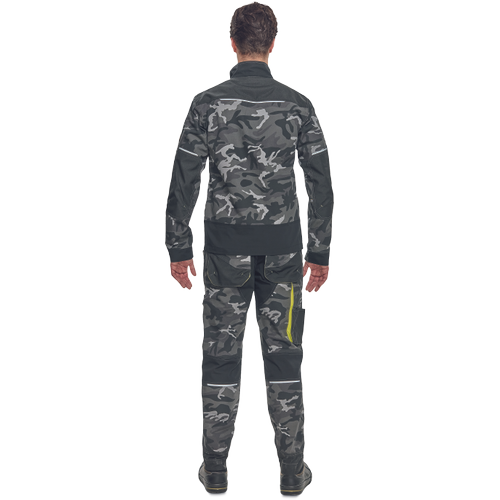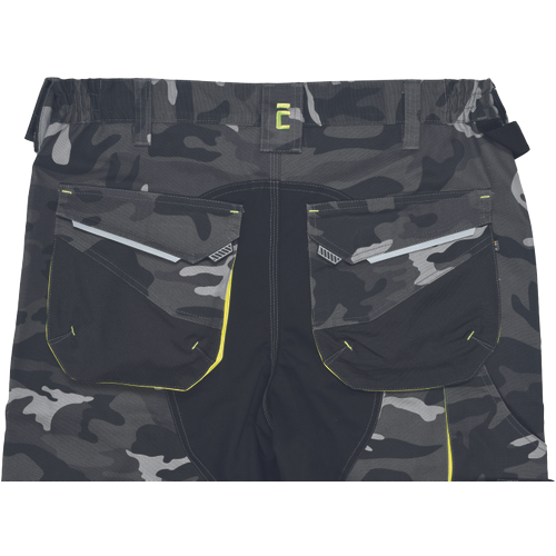 pánské pracovní kalhoty s pružným pasem a multifunkčními kapsami; v moderní úpravě šedé kamuflážové barvy; Oxford 600D zesílení kolenních kapes pro vkládání ochranných nákoleníků; odolné trojité prošití nohavic a sedu; reflexní prvky; nastavitelná délka nohavic.