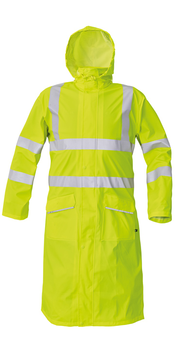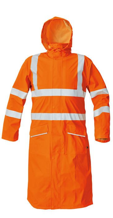 • nepromokavý a větruodolný prodloužený plášť s kapucí v límci • délka 120 cm • obvod kapuce lze stáhnout na tkaničku • dvě přední kapsy kryté légami s reflexní paspulí pro zvýšení viditelnosti • spodní lem rukávů lze polohovat drukem • HI-VIS provedení pouze ve žluté a oranžové barvě