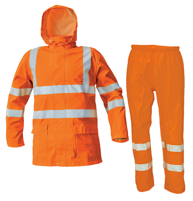 • nepromokavý a větruodolný komplet • ¾ plášť s kapucí v límci a kalhoty s gumou v pase • nešustivý materiál • dvě široké přední kapsy kryté légami proti průniku vody • spodní lem rukávů lze polohovat drukem • HI-VIS provedení pouze ve žluté a oranžové barvě
