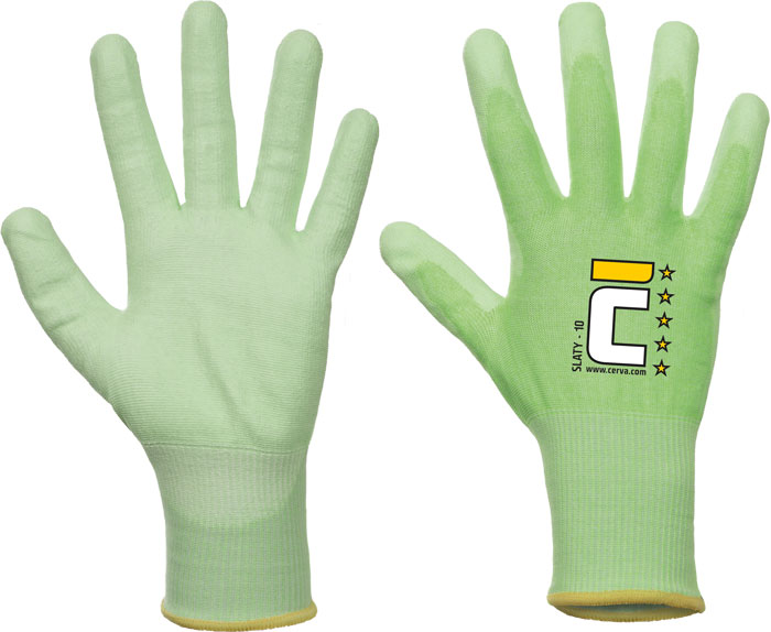 Pletené bezešvé rukavice z jemného 18GG úpletu s vrstvou bílého PU v dlani a prstesch s ochranou vůči řezu D. Rukavice splňuje Oeko-Tex a je možné v nich ovládat dotykové obrazovky.