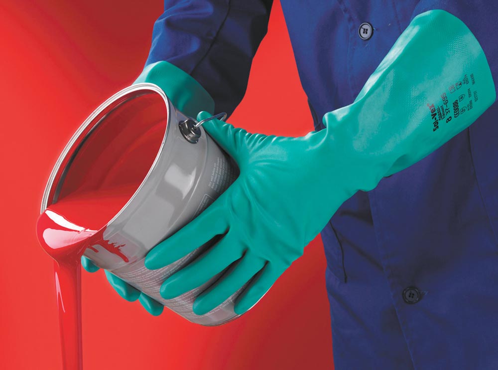 Zelené antistatické rukavice z 0,425 mm silného nitrilu, s velurovou úpravou uvnitř, reliéfním povrchem v dlani a na prstech a odolností proti oděru, v celkové délce 38 cm.