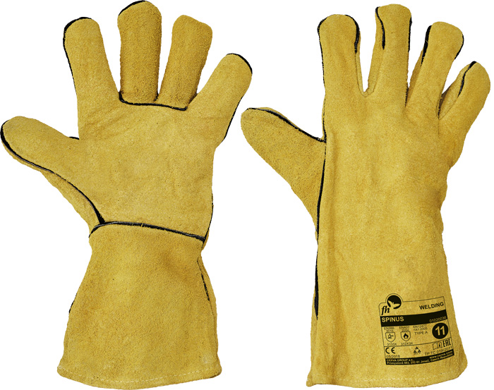 Rukavice ze žluté hovězí štípenky s krytými švy šitými aramidovou nití, bavlněnou podšívkou a v délce 35 cm. Certifikát: svářečské práce - EN 12477+A1