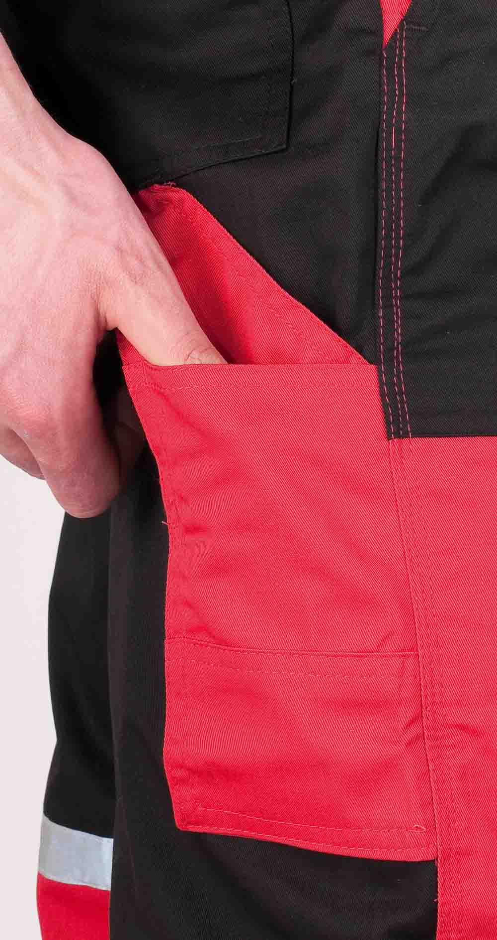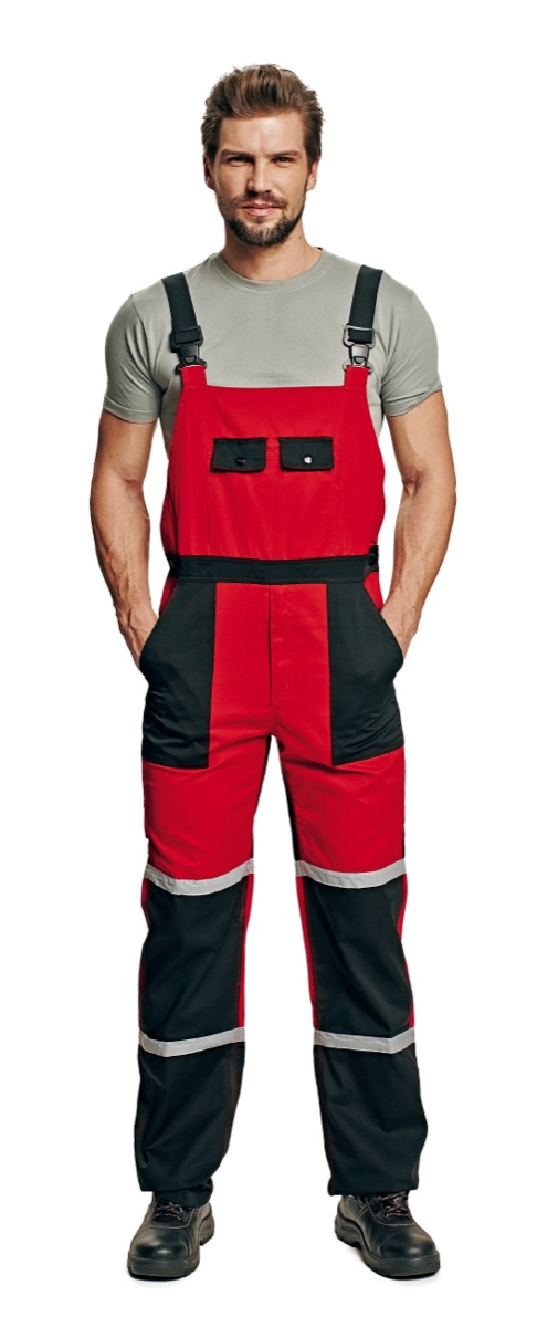 pánské pracovní kalhoty s laclem a elastickým pasem; olejivzdorná a voděodolná impregnace; 6 funkčních kapes; pružné šle s plastovými sponami; reflexní pruhy.