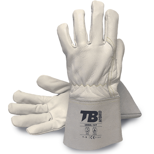 Šedá kozí lícová kůže. Para-aramid+sklolaminátová podšívka. Štípaná kožená manžeta 10 cm. Para-aramidové vlákno.
