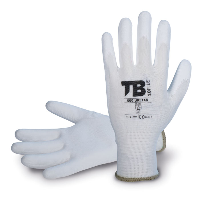• bílá bezešvá nylonová rukavice máčená v PU na dlani a prstech • speciální PU máčen, na kterém se nedrží nálepky (ideální například do skladů) • pletená manžeta • hustota úpletu 13 GG