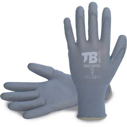 Rukavice z šedého bezešvého polyesteru. Šedý polyuretanový povlak na dlani.