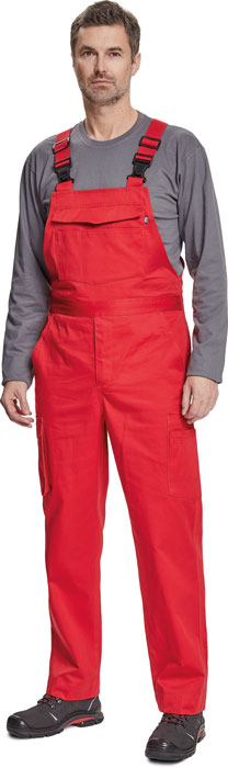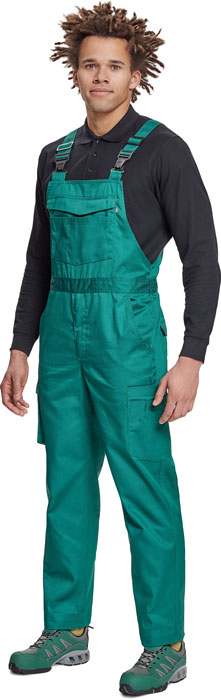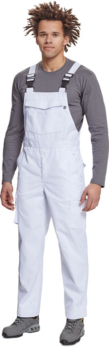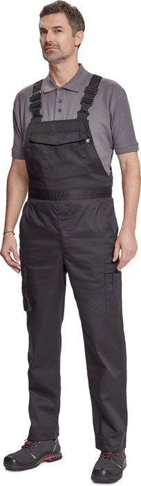 pánské pracovní kalhoty s laclem, elastický pas, 2 boční kapsy + 1 kapsička na drobné, 2 multifunkční stehenní kapsy, 2 zadní kapsy, 1 velká multifunkční náprsní kapsa, elastické šle se zapínáním na sponu, nastavitelná délka nohavic