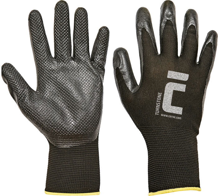 Pletené bezešvé polyesterové rukavice se speciálním protiskluzným nitrilovým povrstvením v dlani a na prstech a pružným nápletem.