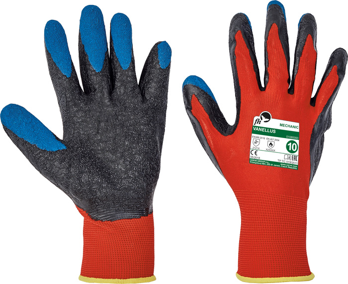Pletené bezešvé rukavice z polyesteru, polomáčené v latexu (zdrsnělá vrstva na prstech a v dlani), elastická manžeta. Delší životnost, zdvojené máčení konců prstů.
