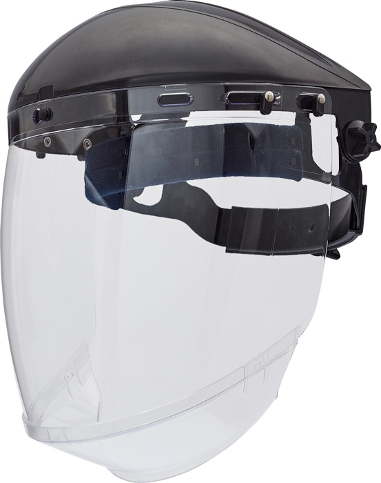 čirý PC celoobličejový štít s náhlavním držákem z ABS; zvýšená ochrana v oblasti brady; zorník třídy 1AT