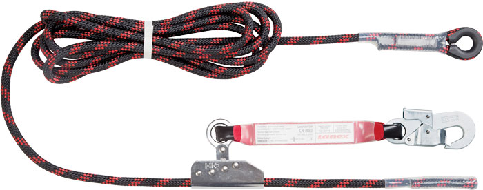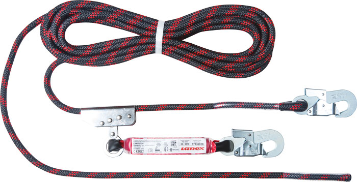 Zajišťovací soupravy LANOSTOP s pohyblivým zachycovačem pádu (brzdu, nelze sejmout), PA splétaným 10 m nebo 15 m dlouhým lanem (O 12 mm), šitým okem s očnicí a karabinou AZ002 na horním konci, šitým dolním koncem bez oka s tlumičem pádu a karabinou AZ002, splňuje normu EN 353-2. 0805 0001 99 110 10m, 0805 0001 99 115 15m