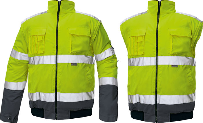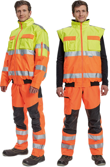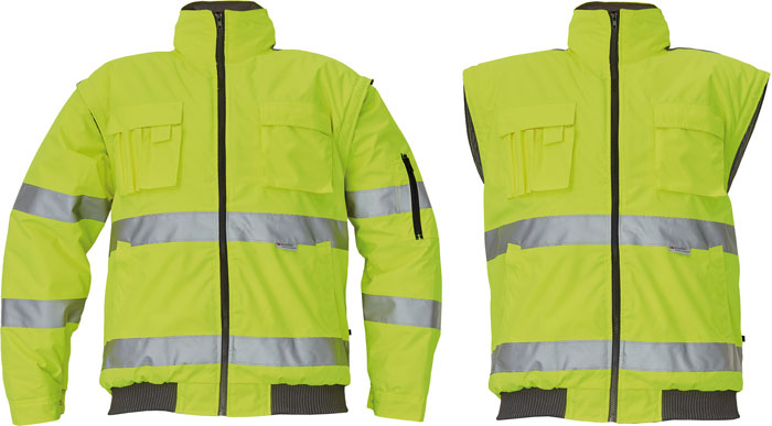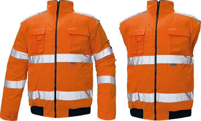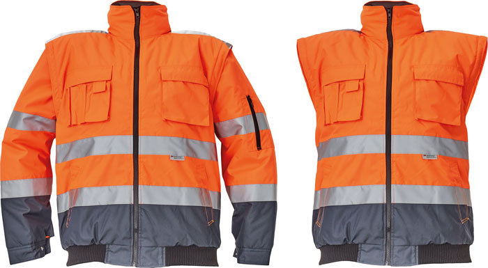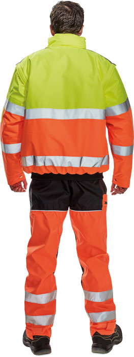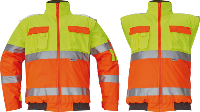 • Hi-Vis bunda 2 v 1 s reflexními pruhy • odepínatelné rukávy a samostatně nositelná vesta • kapuce integrovaná v límci • podlepené švy • reflexní pásky 3M • voděodolnost tř. 3 dle normy EN 343 a paropropustnost tř. 1 dle normy
