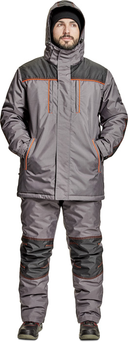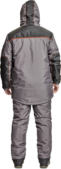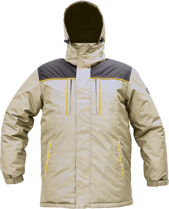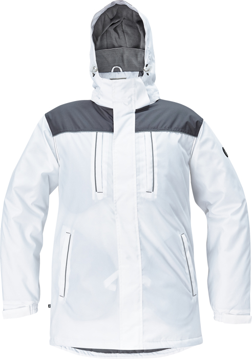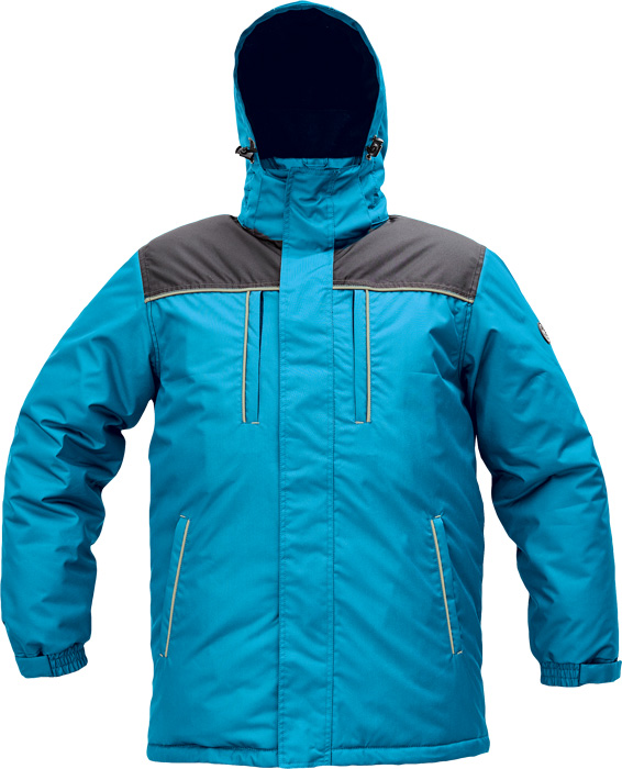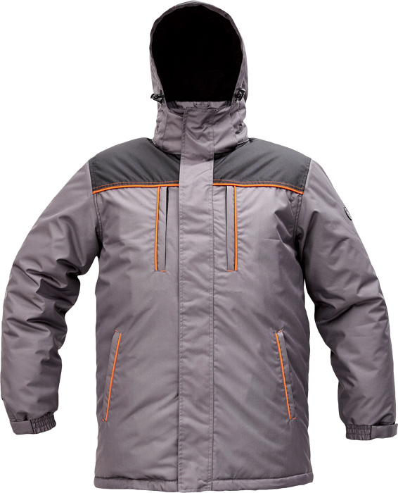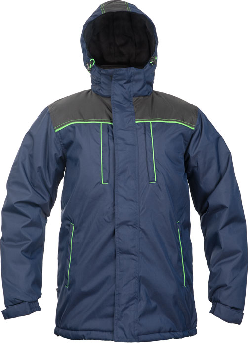 pánská zimní bunda s kapucí, prodloužený zadní díl, 2 náprsní kapsy na zip, 2 boční kapsy na zip, 1 vnitřní kapsa na suchý zip, fleece v límci a kapuci, stahovací šňůrka v pase a spodním okraji, kontrastní paspulky