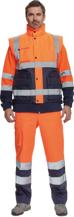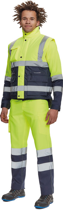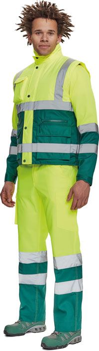 pánská zateplená Hi-Vis vesta s retroreflexními pruhy přes ramena a v bocích, kapuce skrytá v límci, zapínání na zip kryté légou se zapínáním na druky, 2 přední multifunkční kapsy s klopou a zapínáním na zip, 1 náprsní kapsa s klopou