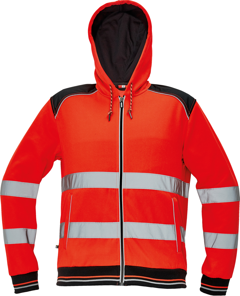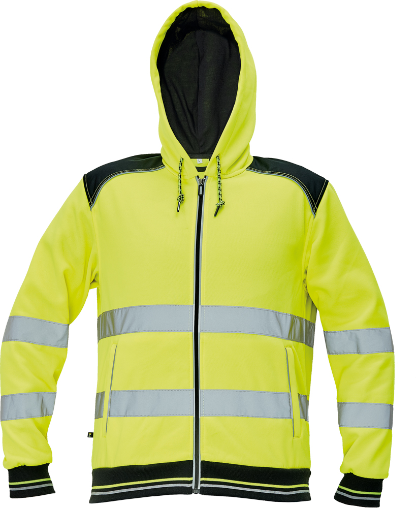 • pánská celopropínací mikina s kapucí v hi-vis provedení ze směsového úpletu polyesteru a bavlny • se 2 našitými reflexními pruhy po obvodu těla a rukávů, ze vnitř nepočesaná • zesílená oblast ramen a loktů • reflektivní paspulka lemující sedlo a lištové kapsy • dvojitá kapuce a dekorativního prošití • pružné náplety na rukávech a spodním obvodu