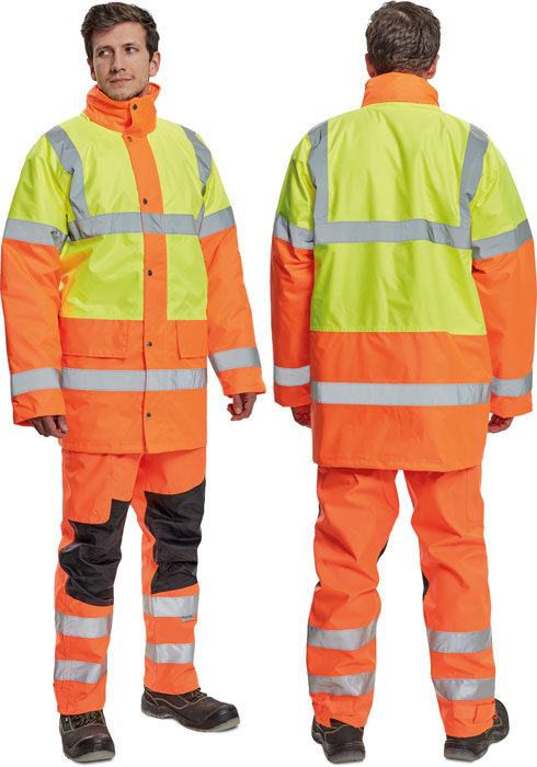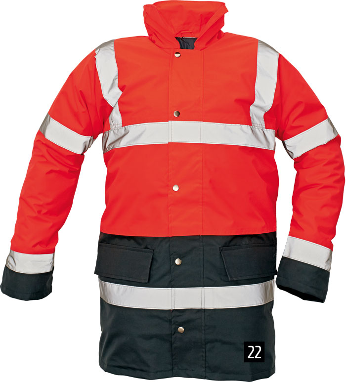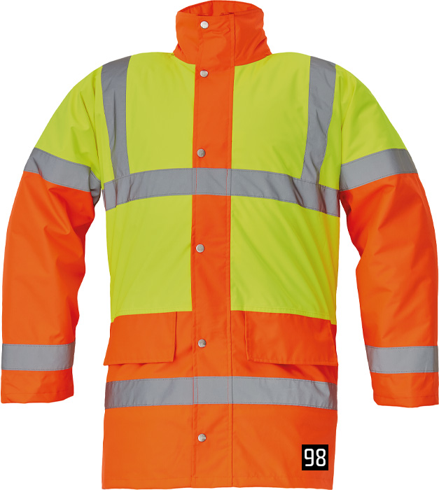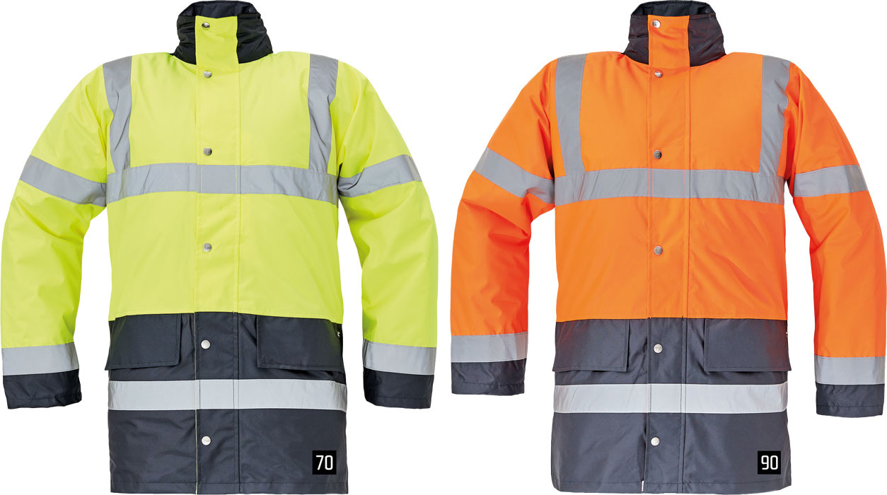 • Hi-Vis zateplená nepromokavá bunda s reflexními pruhy • kapuce integrovaná v límci, obvod je ke stažení na tkaničku • vnitřní pletené manžety • voděodolnost tř. 3 dle normy EN 343 a paropropustnost tř. 1 dle normy EN 343
